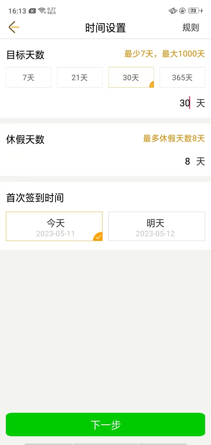 4、设置目标天数,休假天数以及首次签到时间,点击下一步;