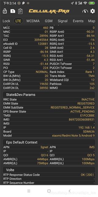 LTE视图显示当前物理层,RRC层的部分参数,常用的有小区(ECI),带宽,频点,信号(RSRP),干扰(SINR),调制方式,传输模式,循环前缀(CP)等重要信息。