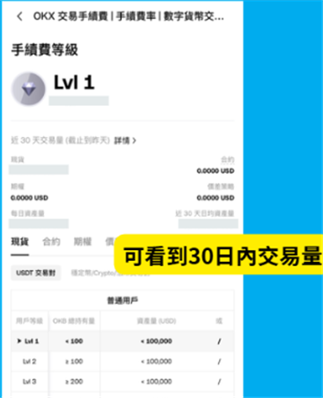 再点入的话会显示自己目前的手续费等级,以及30日内的交易量,因为OKX 手续费等级是照交易量来算的,就可以透过即时数据来看看自己差多少可以到下个手续费等级。
