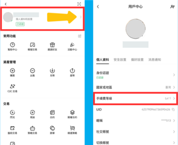 用户可以透过APP左上方的个人资料页,点选「>」到用户中心,就会显示目前的手续费等级。