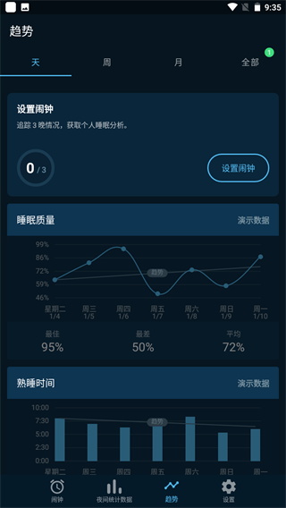4、点击趋势,用户能够对自己的睡眠质量、熟睡时间、睡眠负载等等一目了然;