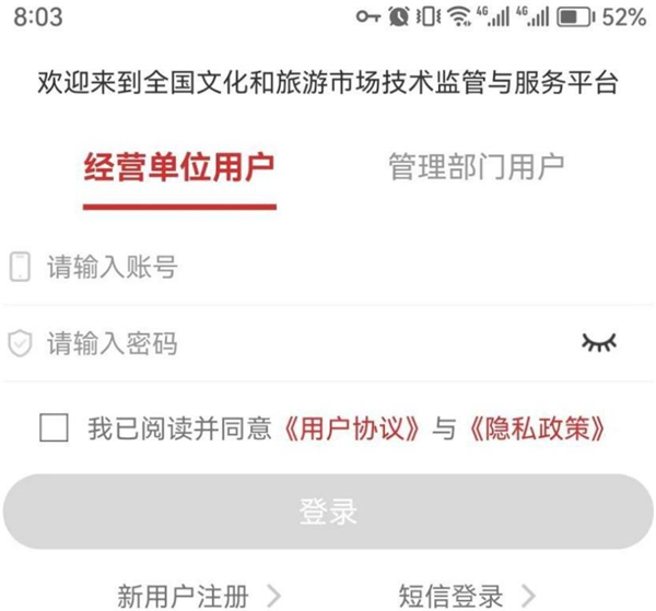 1、下载文旅市场通 APP,打开首页后点击任意操作按钮会跳转到登录页面,如果已在平台上有账号,请输入用户名密码进行登录。如果没有账户,请点击“注册”按钮,填写注册信息。注册成功后方可登录。