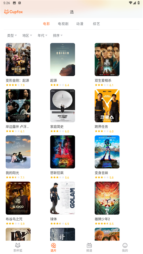 2、通过类型、地区、年代可进行选择电影、电视剧、动漫和综艺。