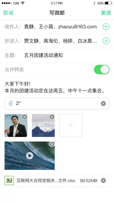 发送邮件的办公助手,同时可添加语音、小视频、文件及照片;