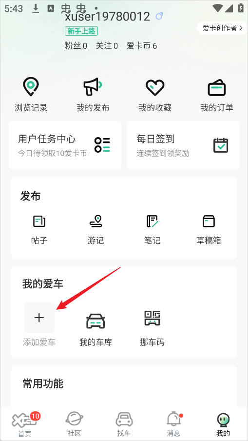 2、找到并选择“添加爱车”功能。