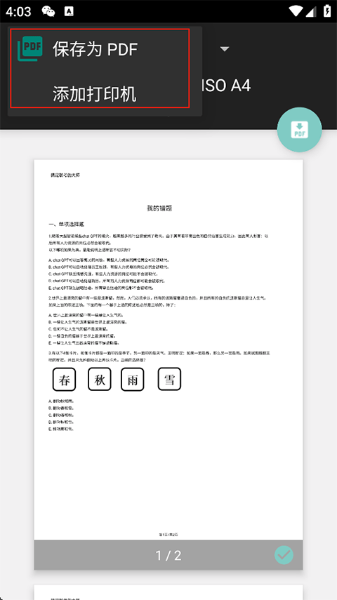 5、点击左上角选择保存为PDF或添加打印机直接进行打印。