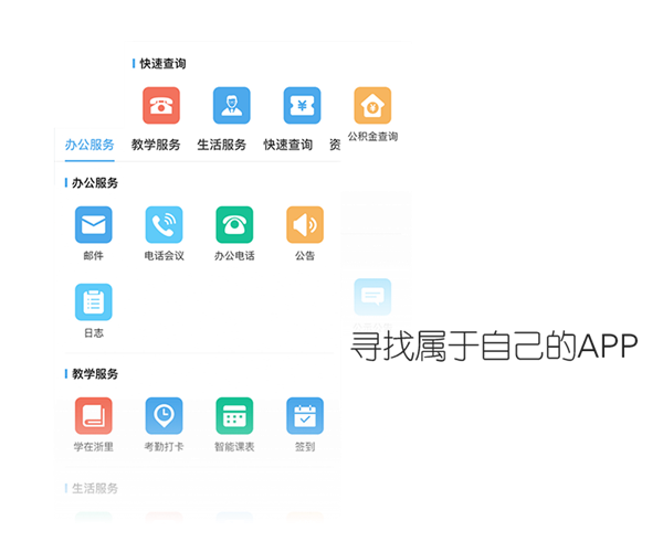 1、首页:登录浙大钉App查看办公服务、教学服务、生活服务、快速查询、资讯......