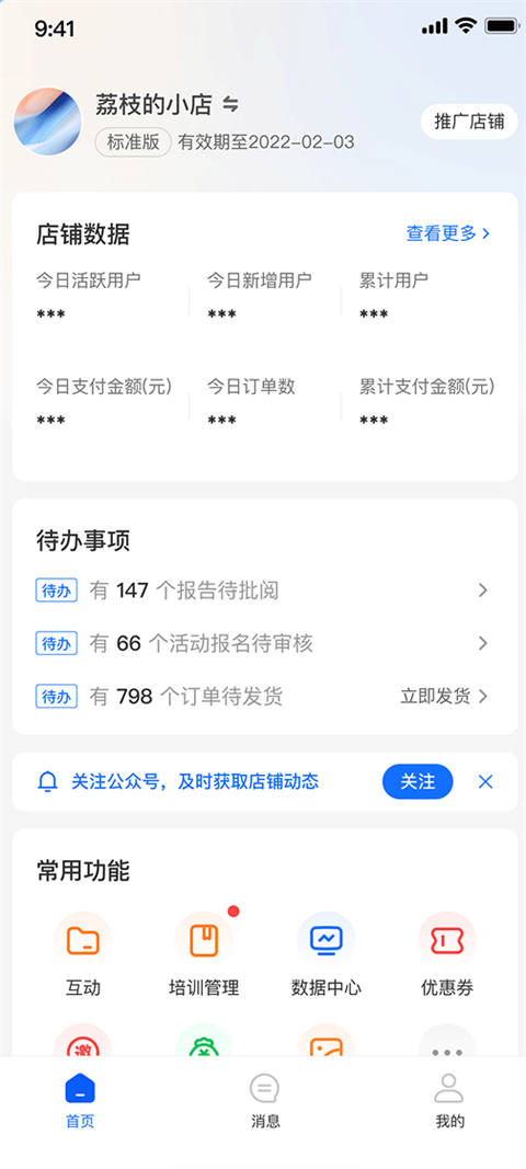 2、支持随时通过移动设备查看店铺核心经营数据,便捷管理商品信息、订单状态、用户资料及客户反馈等内容。