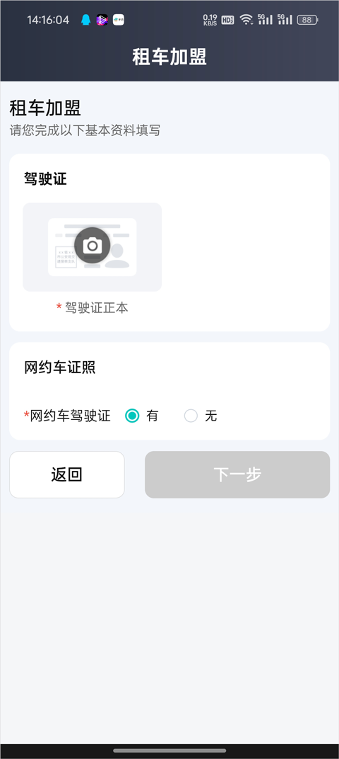 2、系统会提供两种加盟方式:带车加盟和 租车 加盟,可根据实际情况选择,这里以租车加盟为例。